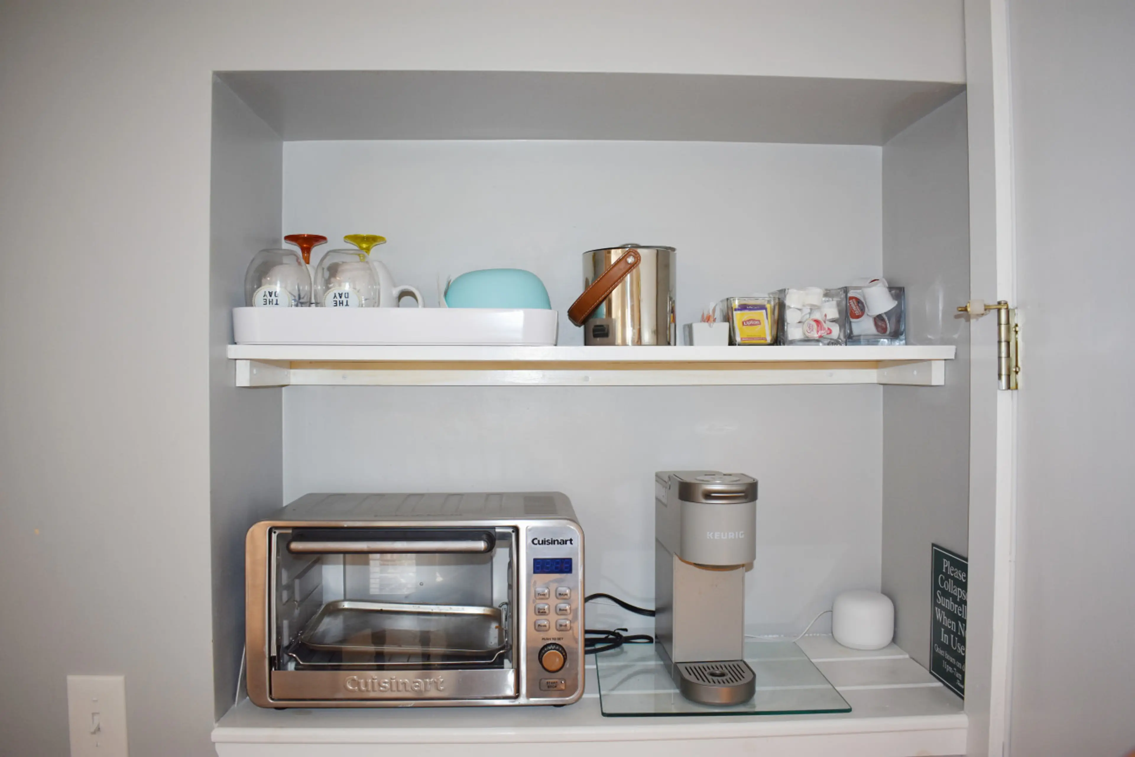 Sweet little in town location, emphasis on “little”. Tiny but immaculate bathroom. No kitchen per se, but the small fridge was very handy. A microwave would have worked better than the toaster oven to reheat leftovers from eating out. Sufficient dishes to have breakfast in. Very pleasant hosts, and all in all we had a nice three day stay.